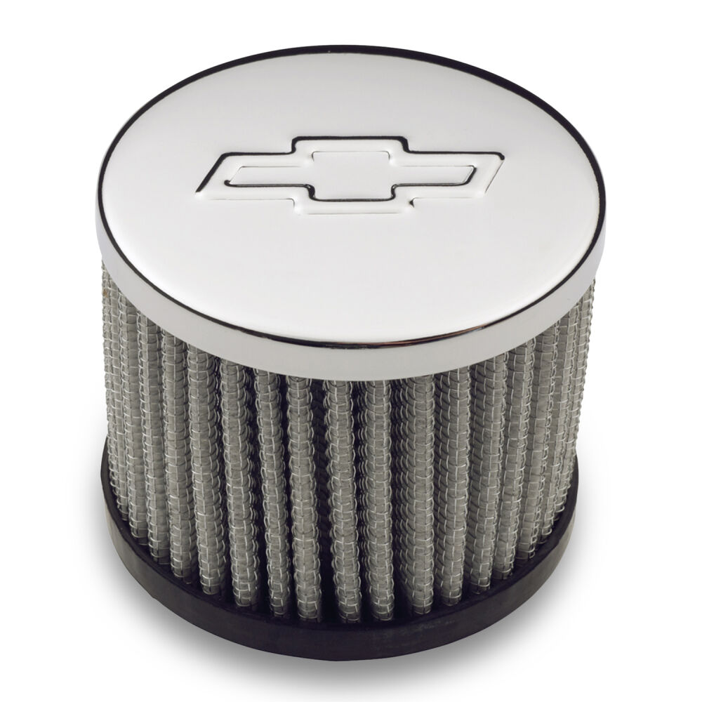 These popular push-in filter air breathers, with the raised Bowtie Emblem stamped prominently in the top, are offered in two styles: with the heat-shield hood and without. 3in diameter.