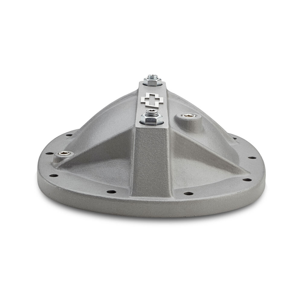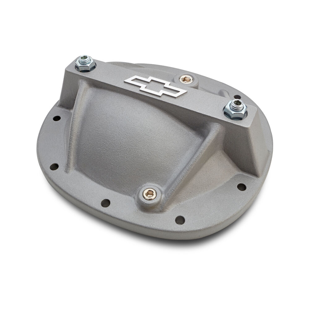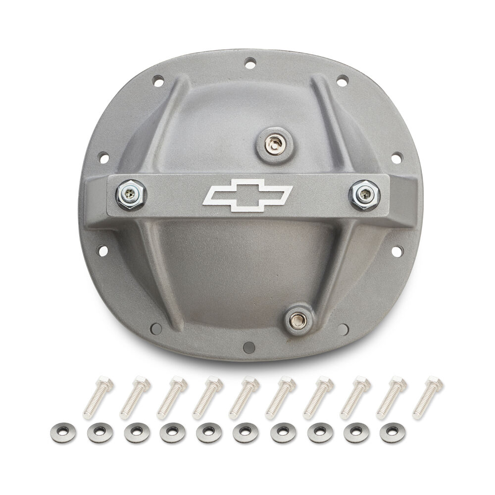Now Shipping!! Reinforced lightweight aluminum rear end cover designed to strengthen the rear housing case in heavy torque situations. The familiar Bowtie Emblem is raised and precision milled on a cast gray crinkle coated surface. Each cover includes two bolts to stabilize bearing main caps, a fluid capacity plug, a magnetic drain plug, and Grade 8 mounting bolts.