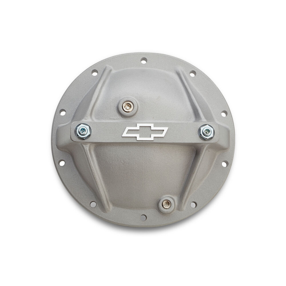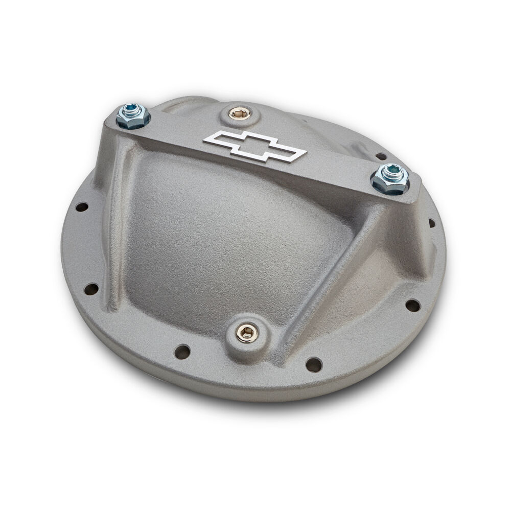 Now Shipping!! Reinforced lightweight aluminum rear end cover designed to strengthen the rear housing case in heavy torque situations. The familiar Bowtie Emblem is raised and precision milled on a cast gray crinkle coated surface. Each cover includes two bolts to stabilize bearing main caps, a fluid capacity plug, a magnetic drain plug, and Grade 8 mounting bolts.
