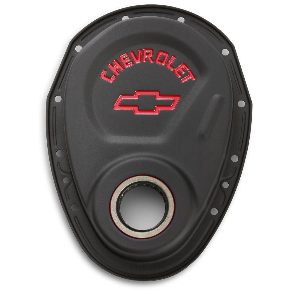 Black crinkle valve covers, with their distinctive look and boldly striking Bowtie and CHEVROLET Emblems, inlaid with classic Chevrolet red, are CED painted for long-term corrosion resistance, and then black crinkle painted on the outer surface. Technical Note: Replacement oil seal: GM P/N 10111769 may be difficult to locate, but Timken® and National® currently produce this oil seal under part no. 9845.