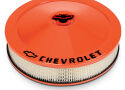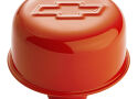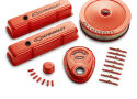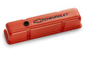 Chevy orange valve covers, with their distinctive look and boldly striking Bowtie and CHEVROLET Emblems, inlaid with black paint. for long-term corrosion resistance the parts are electrostatically painted and baked with a durable orange epoxy. The kit includes a pair of tall baffled Bowtie valve covers (141-784), a 14in classic bowtie air cleaner kit (141-785), a bowtie timing chain cover (141-783), eight bowtie valve cover mini nuts (141-601, two packages), eight bowtie valve cover hold-down clamps (141-782, two packages), and a matching bowtie push-in valve cover breather cap (141-786).