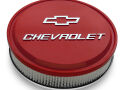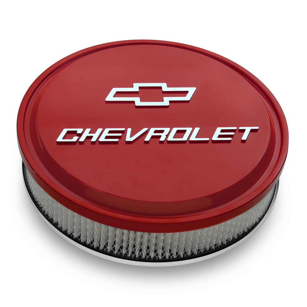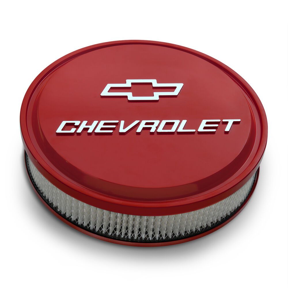 The Red Slant-Edge Air Cleaner is the perfect way to complete your dress-up look in style. The large raised and milled Bowtie and Chevrolet Emblems on this premium 14" air cleaner kit will garner attention whenever you pop the hood!