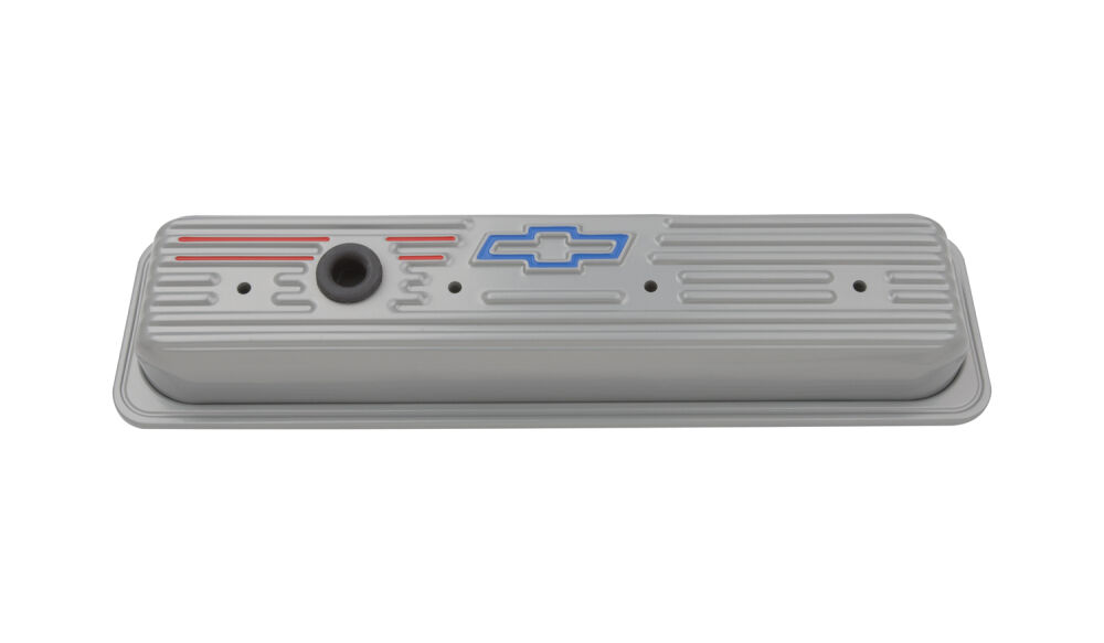 Discontinued. These CHEVROLET Bowtie valve covers are made of heavy-gauge steel, 20% thicker than typical aftermarket valve covers, greatly reducing the likelihood of leakage around the valve cover flange area caused by fasteners being over-torqued. These valve covers bear the powerful Bowtie Emblem. These stamped valve covers are offered in production height (short). Oil restricting baffles are offered in many valve covers for those who wish to maintain the PCV hookup. All valve covers are sold in pairs, equipped with air breather and PCV grommets, unless specified otherwise. Technical Note: Production height Chevy small-block valve covers and valve covers with baffles will not clear most stud girdle applications. Fits Chevy small-block engines 1987 to current.