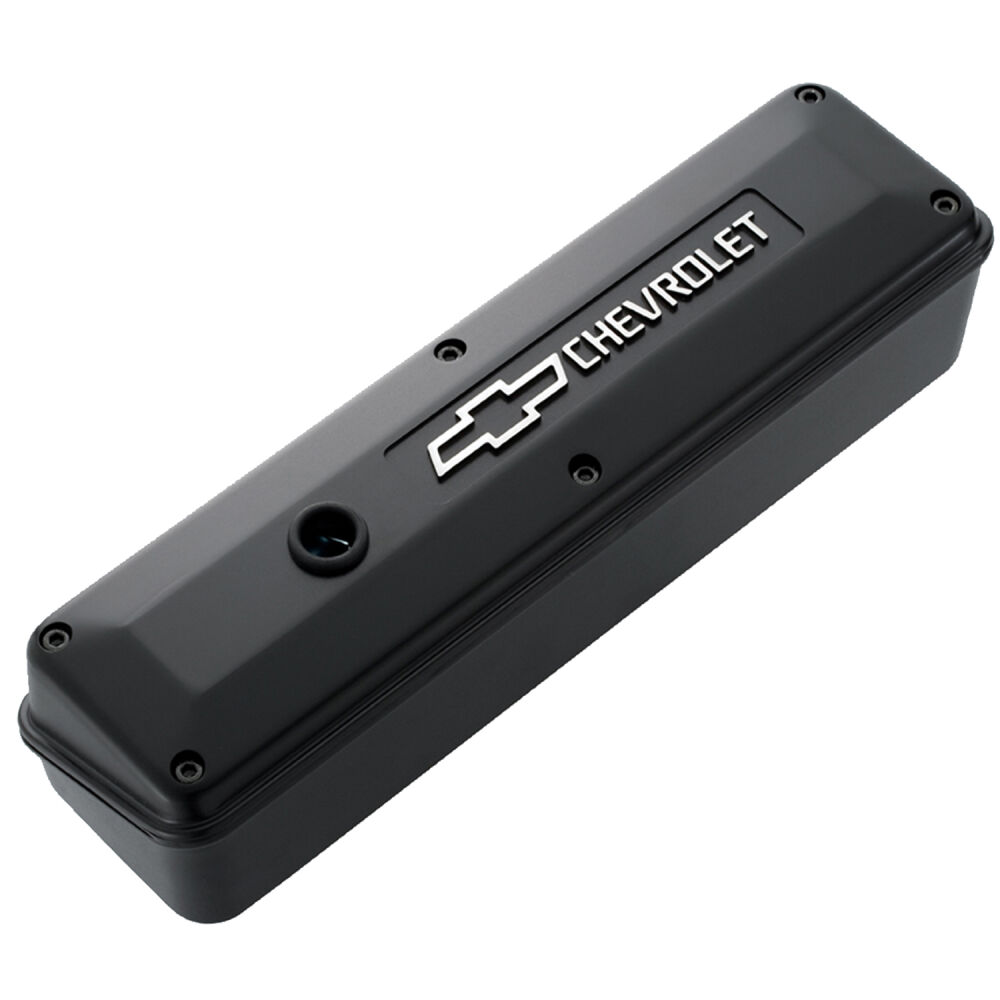 Discontinued. Patented PROFORM 2-Piece valve covers with the popular CHEVROLET and Bowtie Emblems. Now you can easily check your valve train while the engine is running. The diagonal cut of the top section ensures no mess and the gaskets ensure a tight seal. Each valve cover features oversize bolts for fast removal, a top and bottom section, and a retained gasket. Will clear roller rockers and stud girdles and available in six choices. Comes with required Allen wrench. Fits Chevy small block 1958 to 1986 engines. Removable OEM style baffle. Tall. Package contains 1 pair. All valve covers come equipped with baffle and grommets.