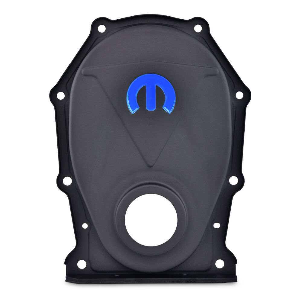 Add a little extra style to the front end of your Chrysler Big Block with these direct replacement timing chain covers. Quality manufactured to exact specifications and made from quality steel material with thick gasket rails help to prevent leaks and optimize oil sealing. The Omega "M" Emblem is recessed in striking blue with the Black Crinkle finish.