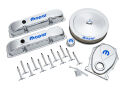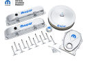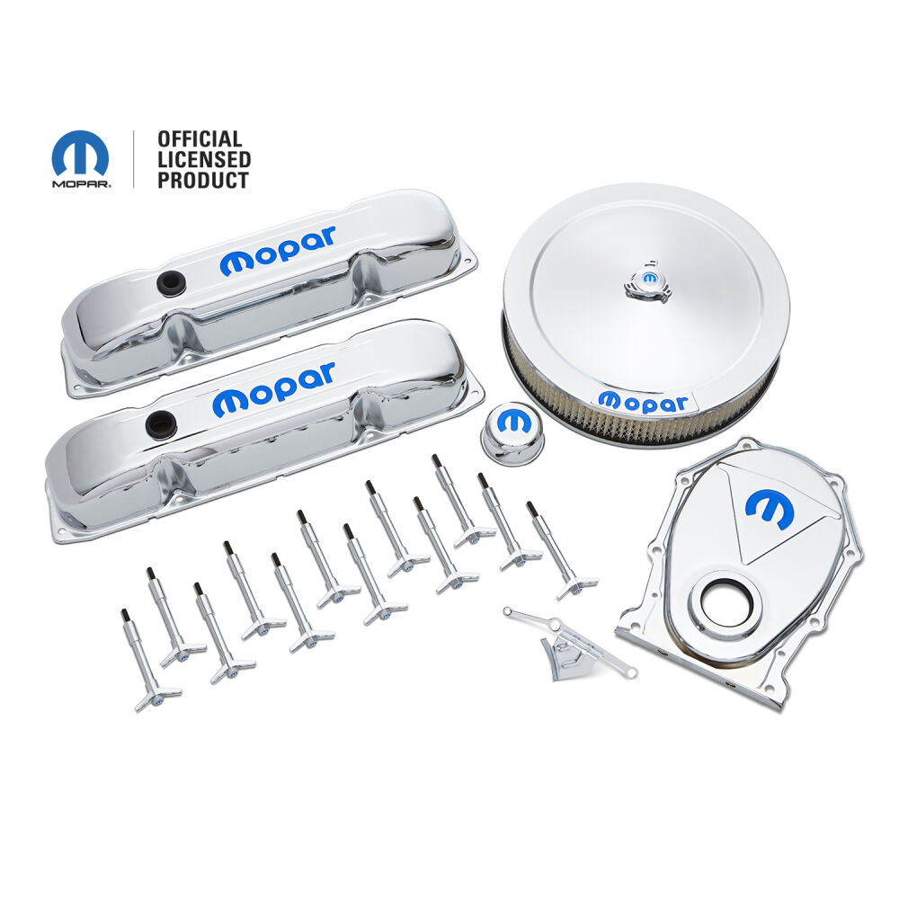 This engine dress-up kit features a premium chrome finish with the new signature blue MOPAR emblem! Made from high quality pre-polished steel. Designed to fit Big Block (B/RB) MOPAR engines. Kit includes a pair of tall baffled valve covers, one 14 inch diameter air cleaner, 12 valve cover wing nuts, one push-in valve cover breather, one timing chain cover, and two valve cover grommets. This is an officially licensed MOPAR product. Sold as one complete kit.