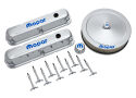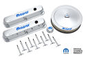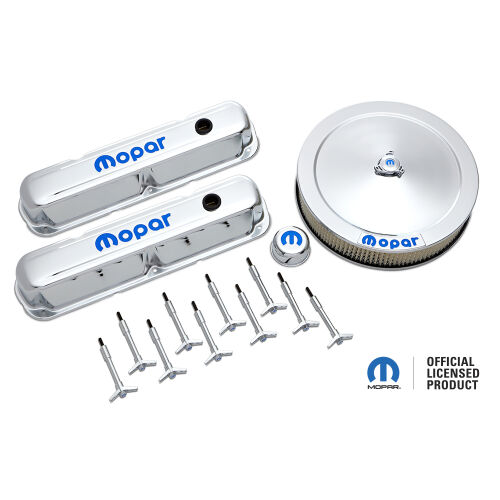 This engine dress-up kit features a great looking chrome finish with the new signature blue MOPAR emblem! Made from high quality pre-polished steel. Designed to fit Small Block (LA) MOPAR engines. Kit includes a pair of tall baffled engine valve covers, one 14 inch diameter carburetor air cleaner, 10 valve cover wing nuts, one push-in valve cover breather and two valve cover grommets. This is an officially licensed MOPAR product. Sold as one complete kit.