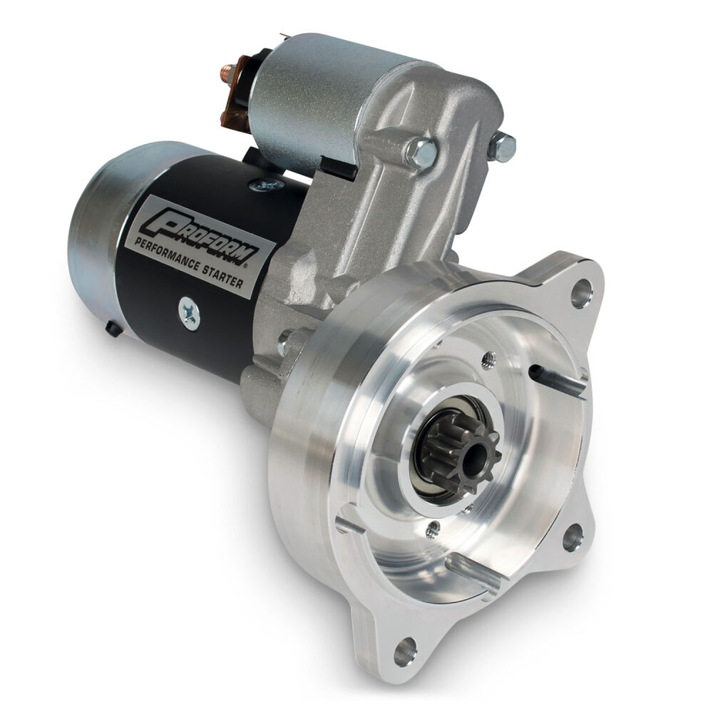 The Ford Manual Transmission, High-torque, gear-reduction design, Starter has a 12V, 2.2KW motor and a torque ratio of 15:1. This PROFORM Starter is 100% NEW, not rebuilt with remanufactured parts! Offset design results in more clearance between the oil pan and the starter, and can be rotated for additional chassis clearance. The high-torque, high-output motor spins the engine over faster than stock starters, delivering 40-50% more cranking power. Includes shims to set pinion-gear engagement (when necessary). Fits Ford Small Block V8, 221-351W engines.
