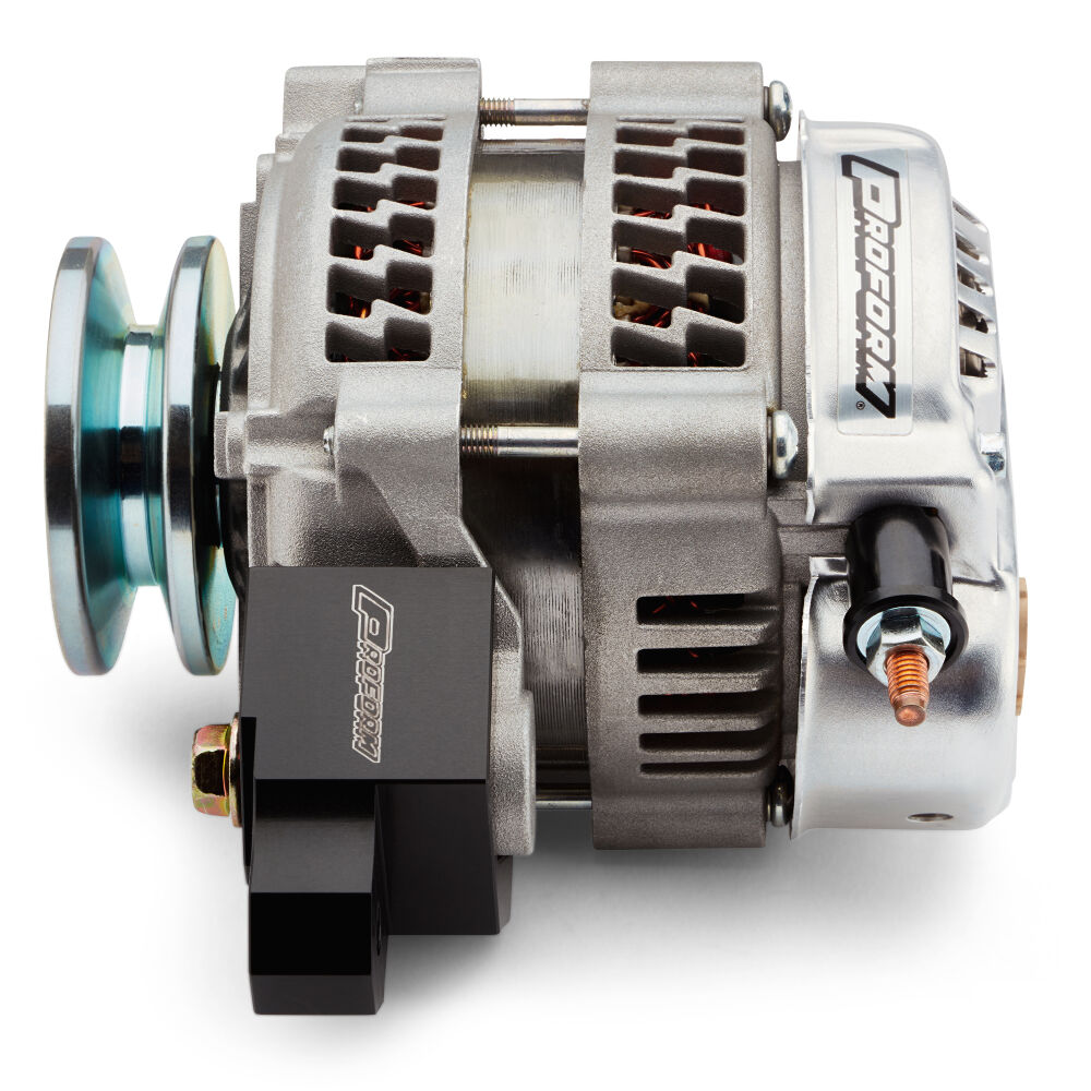 This is a 12 volt, 1-wire hookup alternator. A V-belt style pulley is included, and various serpentine pulleys are sold separately. This alternator uses the same standard universal mounting configuration as 93mm mini alternators. This alternator includes a billet aluminum adapter kit that allows it to fit a standard 10SI mount (6.61" Center-on-Center)...so easy remove and replace!!
