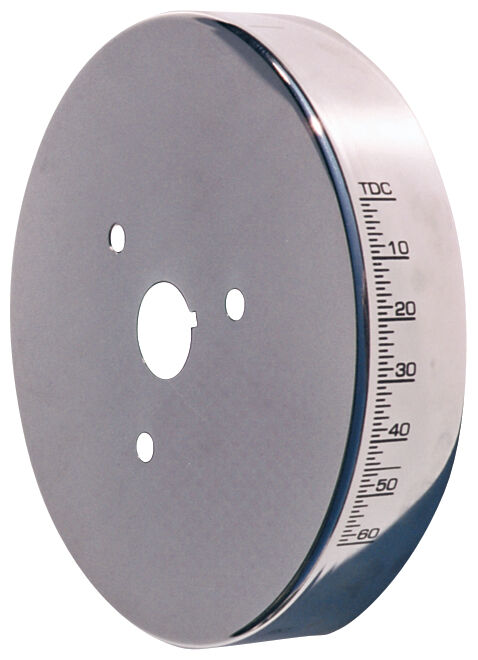 These patented harmonic balancer covers offer improved readability, more stable Top Dead Center indication and timing accuracy, enhanced appearance for a previously ignored underhood area, and the elimination of timing tapes which are inevitably flung off. They are available in chrome and black, resulting in parts with the appearance of $200 balancers. Each cover is distinctively marked with Top Dead Center and the proper timing degrees. Using this cover improves timing accuracy because over time the etched outer inertia ring of a typical harmonic balancer may slip in relation to the center hub of the balancer, causing the etched markings to provide an inaccurate indication of Top Dead Center for the #1 piston. Mounted directly through the center hub, this cover eliminates the affect of any outer inertia ring slippage. Aluminum. U.S. Patent 5,675,078