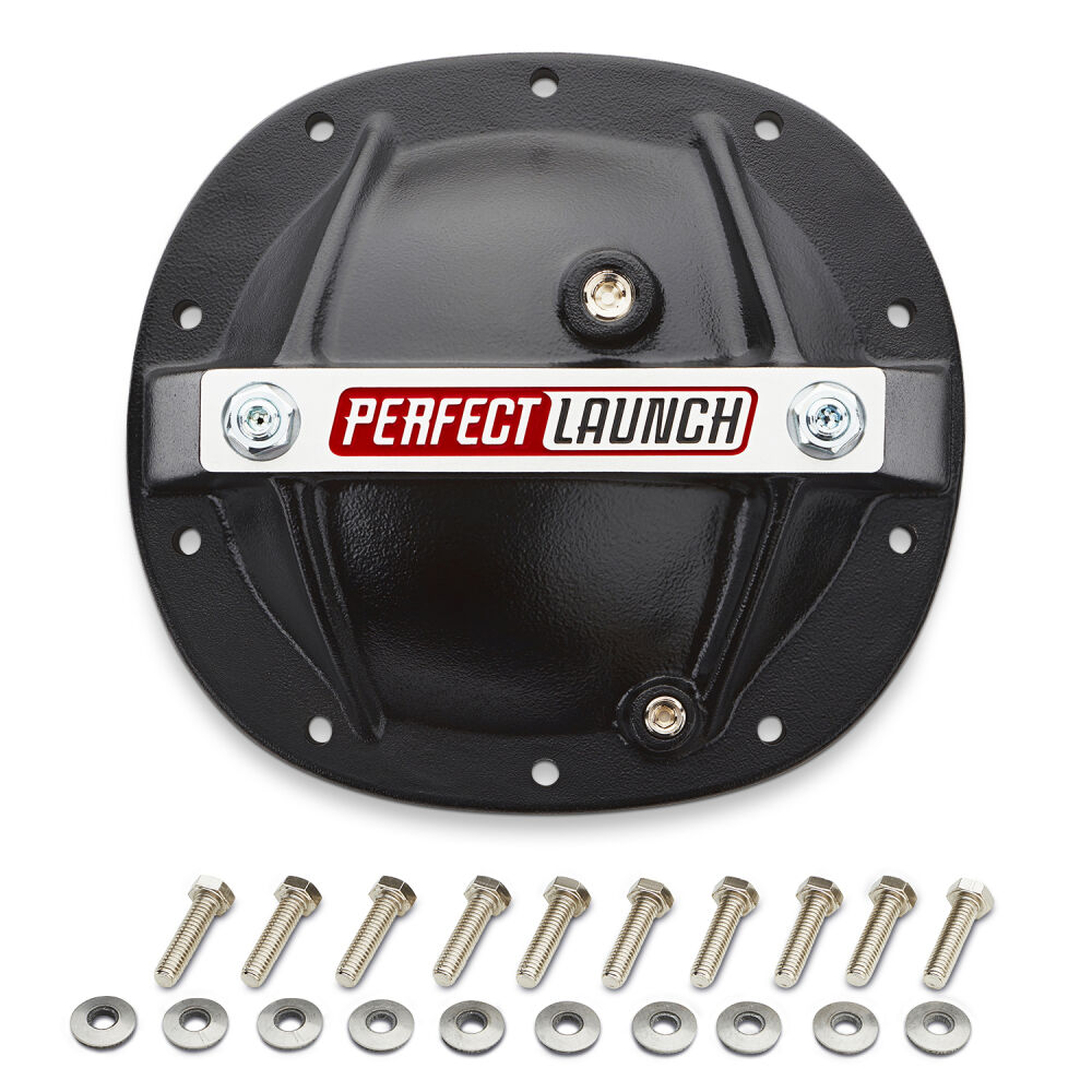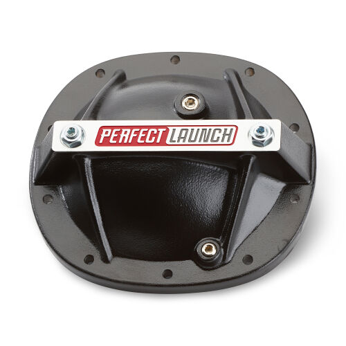 Reinforced lightweight aluminum rear end covers designed to strengthen the rear housing case in heavy torque situations. The PERFECT LAUNCH® logo is prominently displayed on a precision milled surface. Each cover includes two bolts to stabilize bearing main caps, fluid capacity and magnetic drain plugs, and mounting bolts. All covers have a black painted finish.