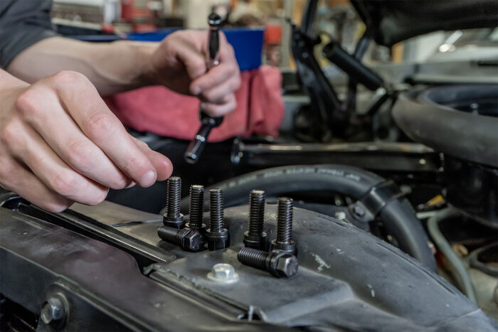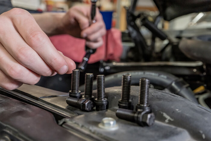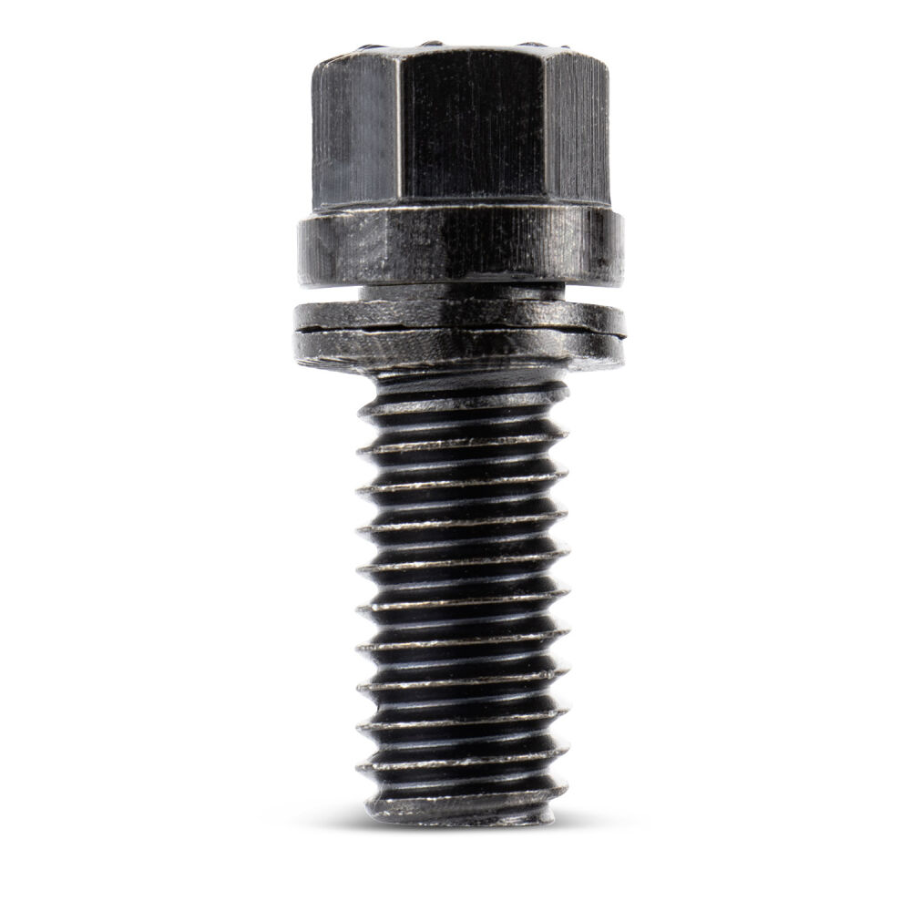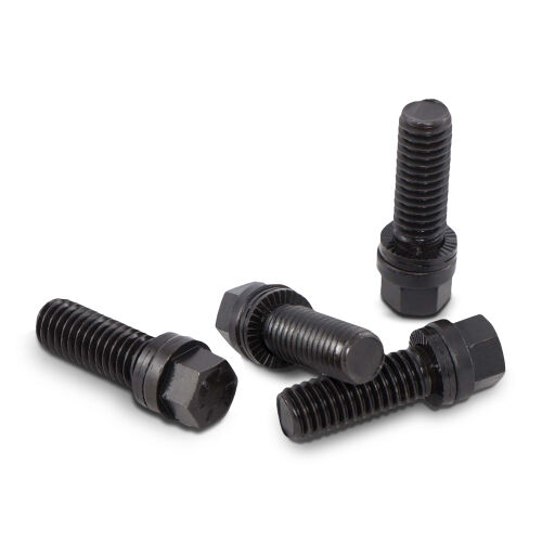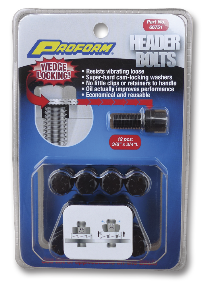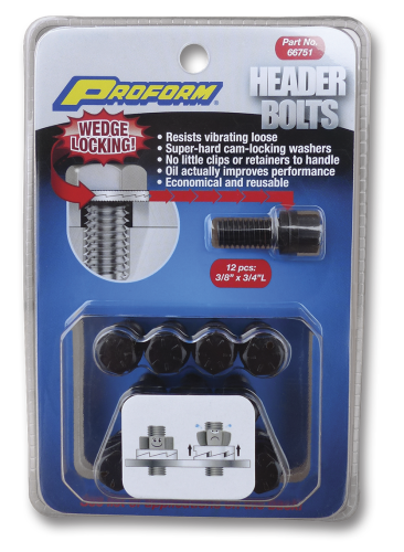 Each PROFORM Grade 8 Header Bolt is permanently assembled with a pair of special washers. When the bolt is torqued to 28+ ft-lbs, the washers super-hardened external teeth bite into and grip the bottom of the bolt head and the top surface of the header. After being self-locked in this manner, any bolt-loosening rotation is blocked by a wedge-locking action created by the washers interfacing, matching cams. Its an uphill climb: vibration that might ordinarily loosen the bolt actually increases the wedge-locking tension, securing the bolt even more. Because this simple wedge-locking method uses tension instead of friction, contact with oil actually facilitates the wedge effect. When changing headers, PROFORM Header Bolts can be untightened with a normal wrench, lubricated, and reused.