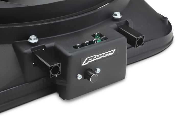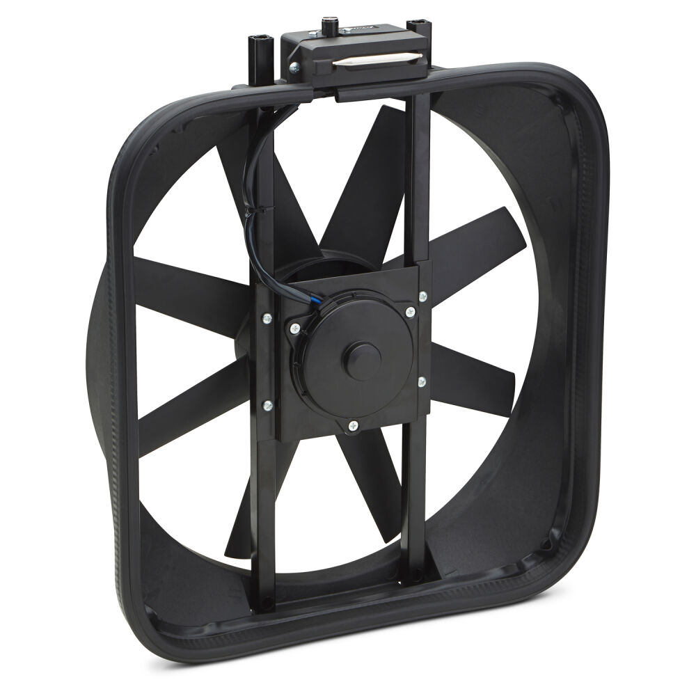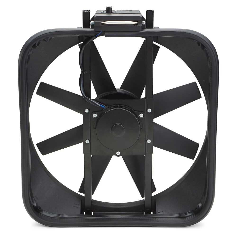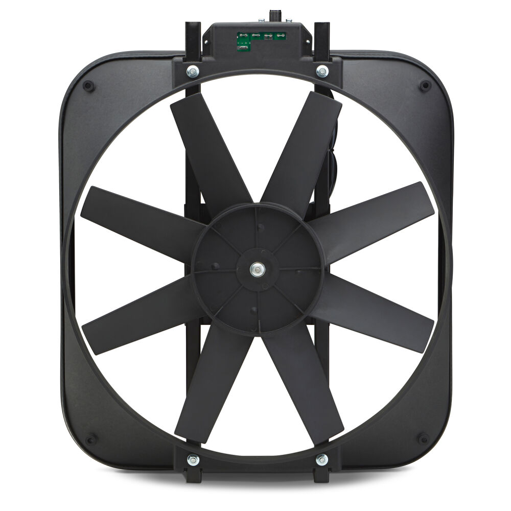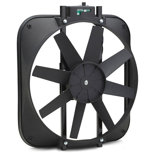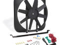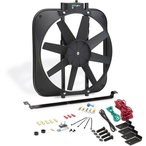 NOW AVAILABLE! Completely new design of our most popular selling thermostat fan. Your stock fan robs your engine of up to 15 or more horsepower! Replace it with a rugged, universal-fit fan equipped with an adjustable 160-240 degree F thermostat. Bolts to your radiator supports using sturdy brackets. with a heavy-duty motor, highly angled blades, and 15 diameter, this unit pulls up to 2,800 cfm of air. Overall: 18 x 16-1/8 x 4.25. Amp draw, 14 amps. Mounting hardware kit, and wiring included.