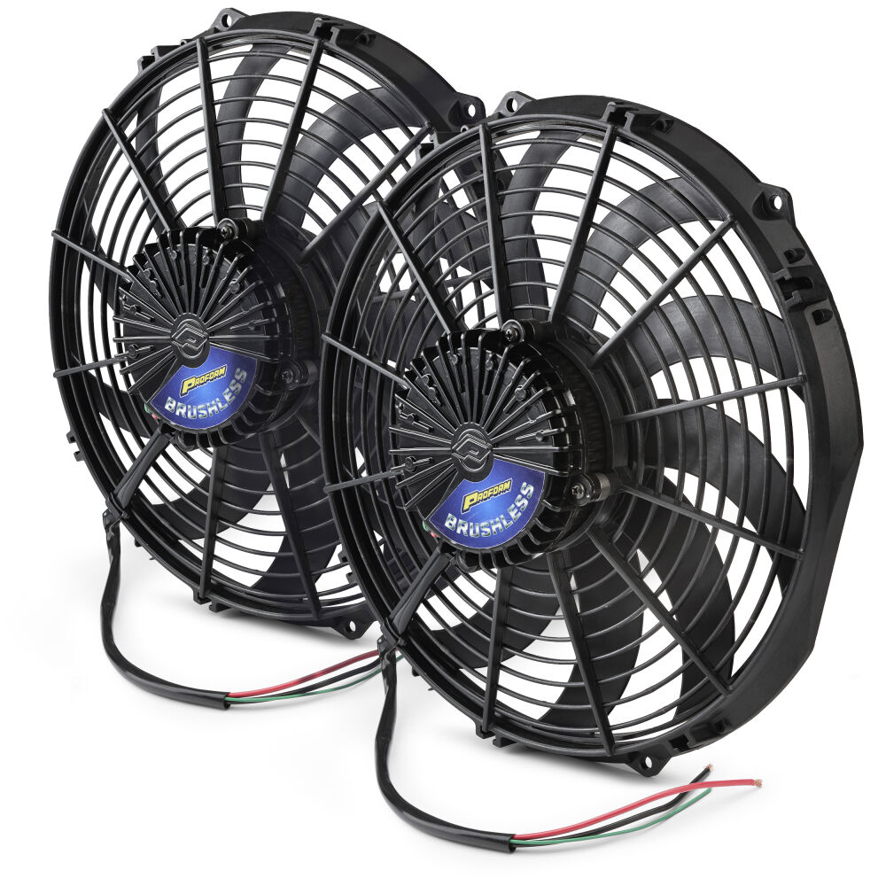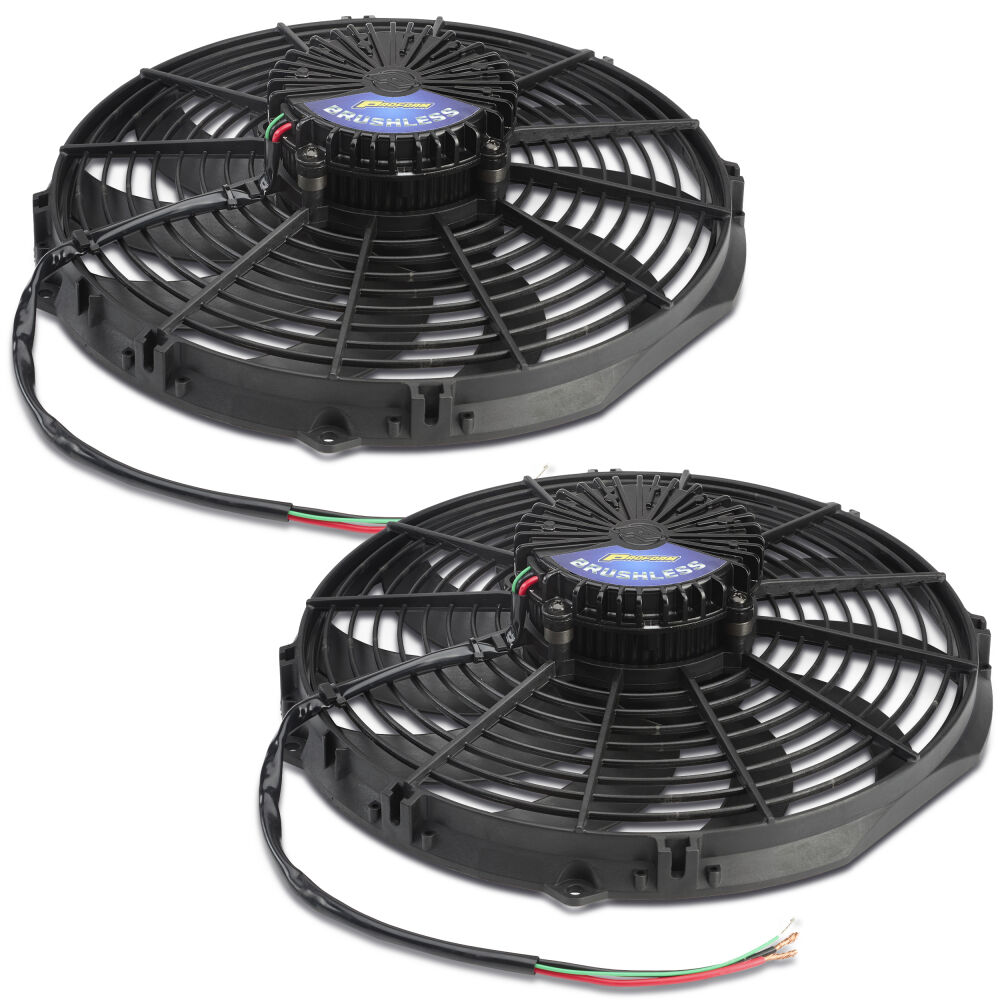 NOW AVAILABLE! PROFORM's new brushless motor electric cooling fans deliver more CFM than the competition for MAXIMUM COOLING. These Brushless fans are lightweight, low-profile, no amp spikes, and create cooling unlike anything out there. The best part is, it's totally universal and designed for 12 volt systems. No fancy engine specific controller required, just wire up the (+) and (-), and you're ready to good. Also compatible with aftermarket ECU controllers, and PROFORM's variable speed controller (p/n 69597). Soft start ramp up prevents amp spikes. This is strictly a puller fan and is not reversible.