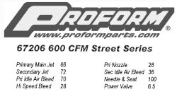 Discontinued. PROFORM's new Street Series Carburetors are hand assembled in the U.S. Based on the wildly successful Race Series carburetors the new PROFORM street carburetors. Constructed of light weight aluminum, changeable idle air bleeds for easy non-permanent calibration changes if needed. Fine tuning is accomplished by simply changing air bleeds not opening calibration restrictions with a drill bit. Each street carburetor features a billet metering block with a street performance calibration developed for today's high performance engines. Four corner idle on mechanical secondary carburetor to help fine tune the idle with aggressive camshaft profile. Changeable idle feed restrictions expand the idle adjustment capabilities. Conventional service and tuning components are available in most performance retail outlets. Also the billet throttle body for superior strength, coupled with precision throttle shafts to ensure long term performance. All PROFORM carburetors have easy access adjustable secondary air flow. Others require special tools or removal of the carburetor to accomplish this simple adjustment. Complete with high quality, light weight die-cast aluminum fuel bowls with fuel level windows for quick reference. Float level changes do not require removal of a sight plug with the risk of fuel spilling. Bowls come equipped with 3/8in inverted flare fuel inlet fittings and will accept all conventional dual feed fuel lines compatible with Holley four barrel carburetors. Like all PROFORM carburetors, service parts are readily available however, should you not find PROFORM service parts, our carburetors are compatible with any modular carburetor service parts available at a local parts store or retail outlet.