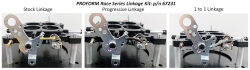 The kit includes three different linkages: stock, 1:1, and a super progressive. Washers and cotter pins are included.
