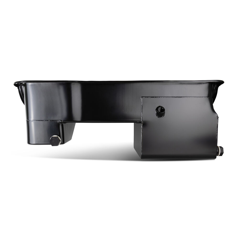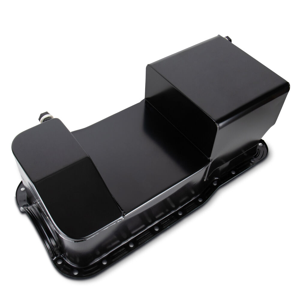 Seven quart Ford Oil Pan model for 1981 to 2001 Small Block Ford 289-302 Engines in Fox Body Mustangs, T-Bird and Cougars. Designed for use with Proform Oil Pump Pick-Up (P/N 68051; sold separately). This pan is optimized design to clear rack and pinion, and features a 8-1/4" deep rear sump. Made from high-quality steel. Black CED paint finish.