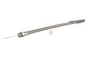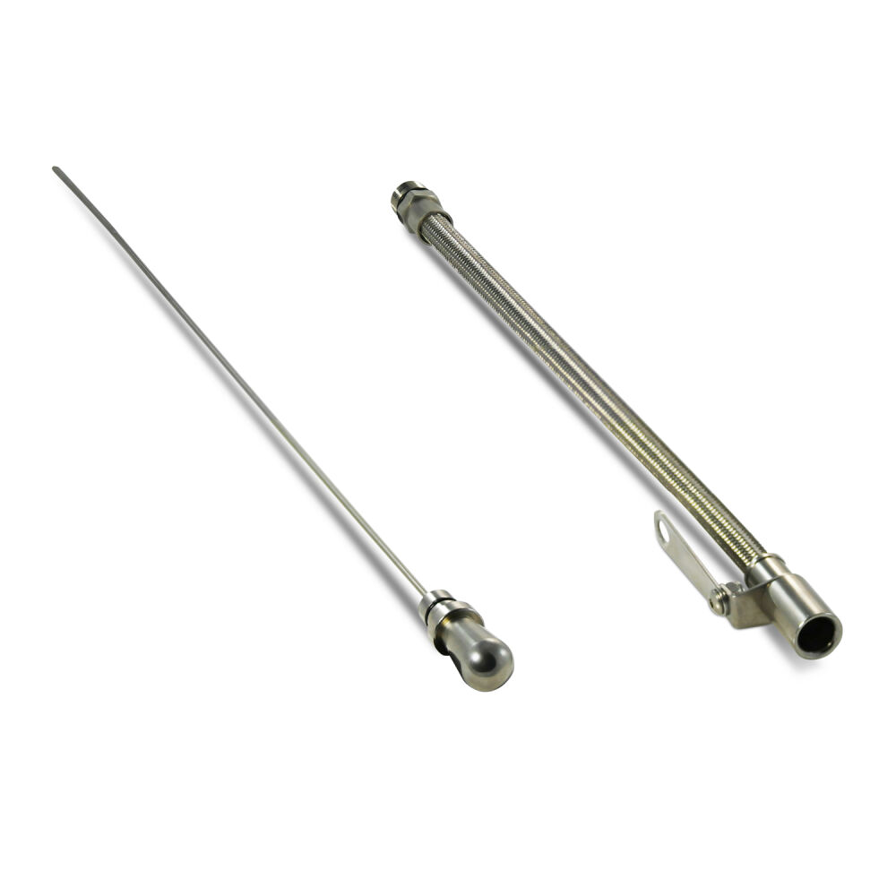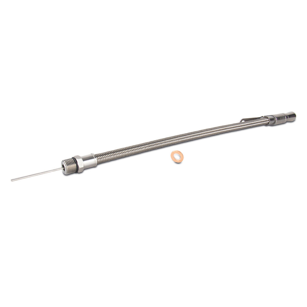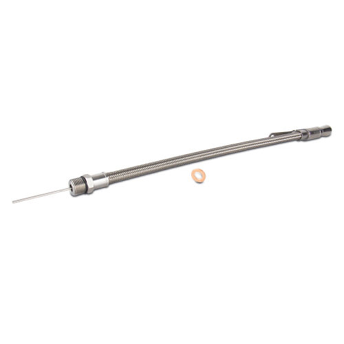 This flexible braided stainless steel dipstick is the perfect addition to your Ford oil pan. This part screws into the oil pan, so make sure you have the appropriate threaded inlet. The thread is 5/8"-18. Adjustable mounting tab ranges from 11.25" to 15.25" from where the dipstick screws into the oil pan. Fits: 289-302-351W-429-460.