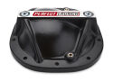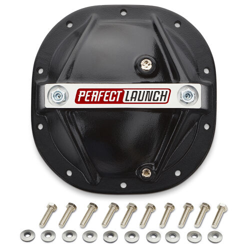 Reinforced lightweight aluminum rear end covers designed to strengthen the rear housing case in heavy torque situations. The PERFECT LAUNCH® logo is prominently displayed on a precision milled surface. Each cover includes two bolts to stabilize bearing main caps, fluid capacity and magnetic drain plugs, and mounting bolts. All covers have a black painted finish.