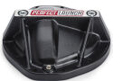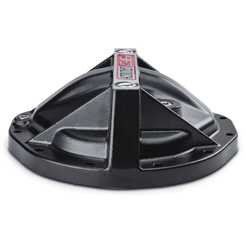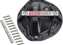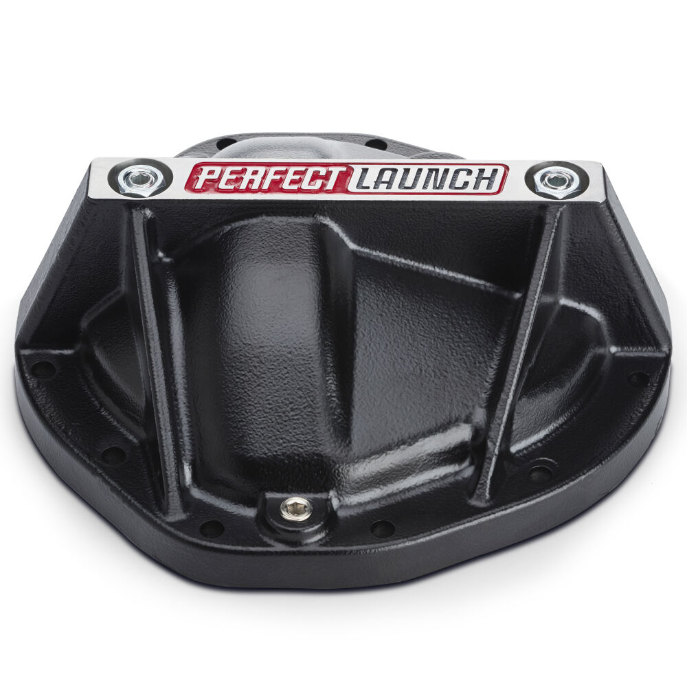 Reinforced lightweight aluminum rear end covers designed to strengthen the rear housing case in heavy torque situations. The PERFECT LAUNCH® logo is prominently displayed on a precision milled surface. Each cover includes two bolts to stabilize bearing main caps, fluid capacity and magnetic drain plugs, and mounting bolts. All covers have a black painted finish.