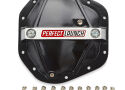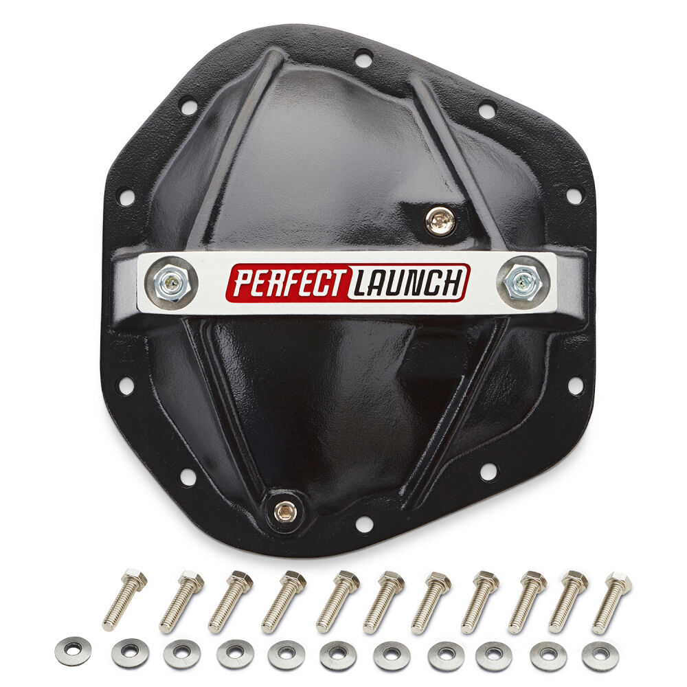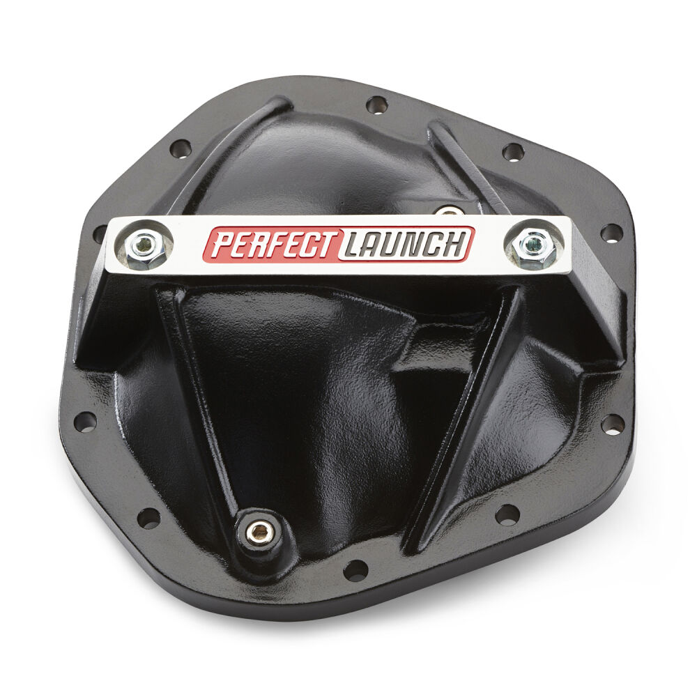 Reinforced lightweight aluminum rear end covers designed to strengthen the rear housing case in heavy torque situations. The PERFECT LAUNCH® logo is prominently displayed on a precision milled surface. Each cover includes two bolts to stabilize bearing main caps, fluid capacity and magnetic drain plugs, and mounting bolts. All covers have a black painted finish.
