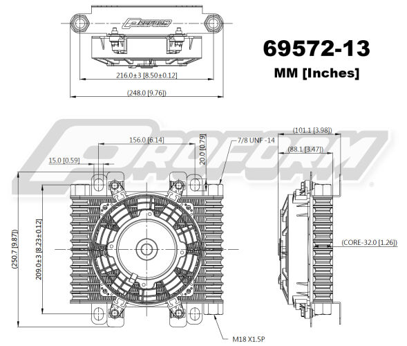 The powertrain is expensive. To avoid costly repairs, prolong its life, and protect its components from standard wear and tear: keep the fluid temperatures cool! If you're into high speed driving, off-roading, racing, pulling heavy loads, or if you just need some extra cooling to work in conjunction with your current setup, then PROFORM’s Tundra Series Cooler & Fan Combo will give you effective cooling in a compact footprint. A major component of that cooling capacity can be found in the 12-volt high capacity 6-amp fan that pulls 285 CFM of air through the all-aluminum cooler. The cooler’s proprietary fin louver design provides maximum surface area while minimizing negative airflow resistance. The fan wiring includes a bi-metal temperature switch that turns on the fan when fluid temperatures reach a specified degree range.